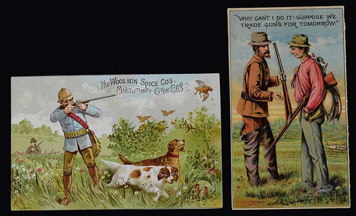 Description:Lot of (2) c.1900s-10s hunting themed trade cards (Overall EX) Includes 3.5"x6" heavy stock card with color lithographed hunters scene on front that has "A.G. Spaulding Bros." sign in back ground. Back lists a pair of testimonials and it is likely that there was another section which is now missing; 4"x6.25" "Wilson Spice Co" trade card with Lion Coffee advertising back. Touch of light wear: Overall EX