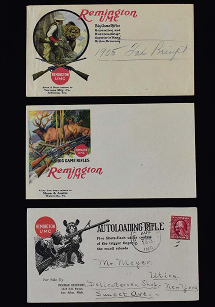Description:Lot of (3) Remington rifle advertising covers c.1900s-10s (EX-EX/MT) Trio of nicely illustrated covers with (1) postally cancelled and (1) other with pencil notations on front. Light toning/wear: EX-EX/MT