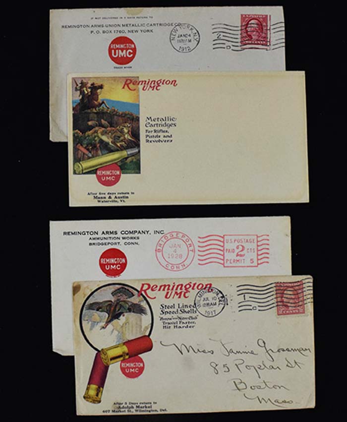 Description:Lot of (2) c.1910s Remington UMC covers and (2) mailing envelopes (VG-EX/MT) Includes pair of nicely illustrated covers with (1) being unused. Other is postmarked 1917 with mild toning and some wear; 1912 and 1928 postmarked envelopes with Remington Arms Company and UMC logo in return address area. The 1912 is opened along right edge and some toning at edges: VG-EX/MT