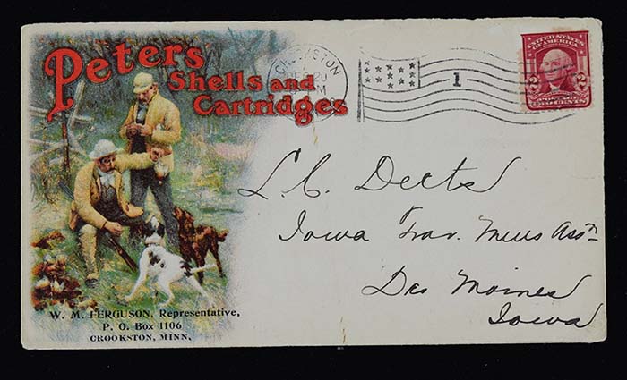 Description:Choice Peters Shells and Cartridged advertising cover c.1908 (EX) Nicely done cover with bright graphic on front and additional multi-colored text on back. Postally cancelled (appears to be dated 1908) with some light to moderate edge wear and small tear on one side. Opened along top edge: EX
