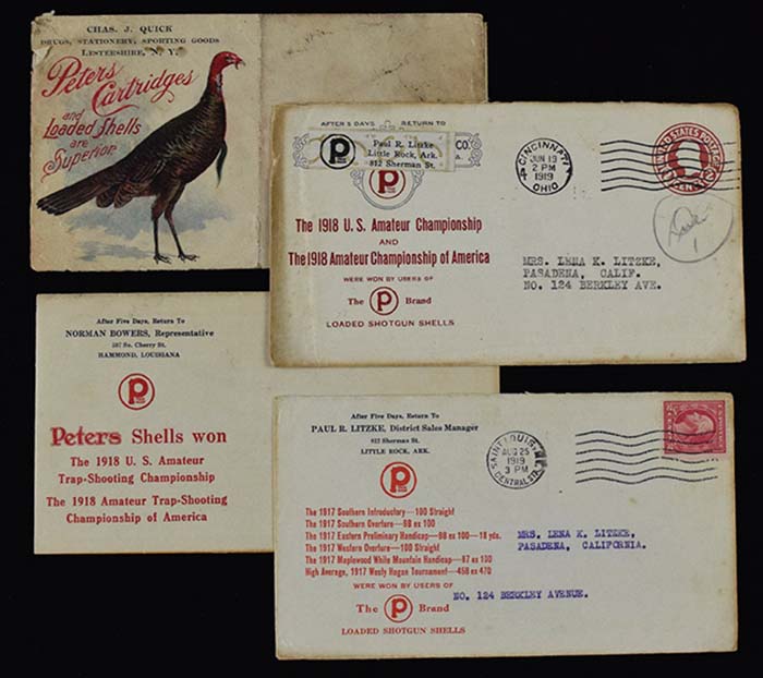 Description:Peters advertising covers and envelopes (5) c.1900s-10s (EX) Includes colorfully illustrated cover with design continued on back which has discoloration throughout and a vertical fold at center. There is some light wear/chipping to edges; Three Peters mailing envelopes with variations in the printed on text (one unused); and "Harris & Hiscock" envelope which advertises that they offer Peters Cartridges.