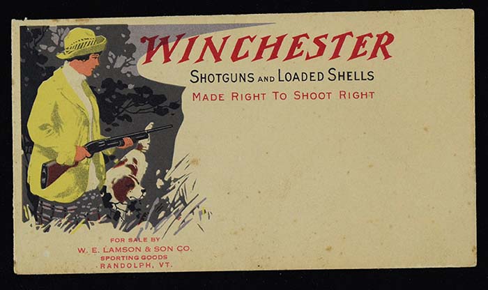 Description:Choice 1910s Winchester advertising cover (EX) Classic design is unused with some mild toning throughout along with some scattered spots of discoloration. Very light additional wear includes a minute tear at upper left: EX