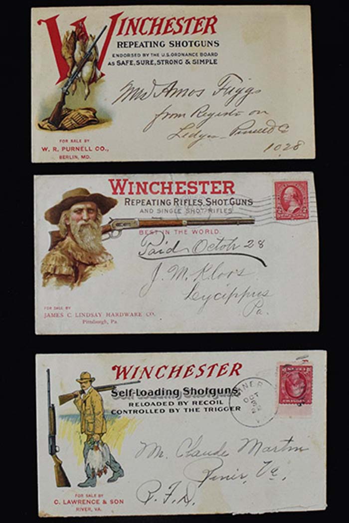 Description:Lot of (3) c.1900s-10s Winchester advertising covers (GD-EX) Very nice trio includes hanging birds design which has address written on but was never mailed. This example has light toning and touch of wear; earlier example postmarked 1902 which has some light toning and mild wear incl minute tear at top edge; additional postmarked cover with similar toning/wear that has been opened along bottom edge: GD-EX