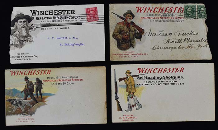 Description:Lot of (4) 1910s Winchester advertising covers (GD to EX-EX/MT) Includes very nice design showing a pair of hunters and dog which is unused with some mild toning throughout along with some chipping and light wrinkles. Right edge has split and has some tears; unused example which has some very light toning and minimal wear; and (2) postally cancelled covers which have each been torn at one side. One of these has discoloration and wear throughout: GD to EX-EX/MT