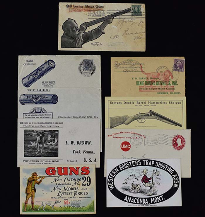 Description:Nice lot of asst. hunting and gun related covers, envelopes, paperwork, etc (1900s-70s) (GD-NM) Includes 1908 postmarked Union Metallic Cartridge Co. return address envelope; J.Stevens Arms Double Barrel Hemmerless Shotgun promotional piece (paper slip, slightly smaller than cover size); (2) c.1930s Sellier Bellot Hare Cartridge nicely done covers from Bombay which are both addressed to Winchester Repeating Arms Co. One is postally cancelled; 1906 postmarked Ithaca Guns cover which has crayon and other marking along wear throughout; 1930s A. F. Stoeger Gun Catalog advertising postcard; 30s-40s Western Boosters Trap Shooting Assn. postcard; Dalton Rod & Gun Club postcard; 1939 National Wildlife Ruffed Grouse postcard; (2) c.1930s "Dixie Hound Kennels" mailing envelopes with related letters and papers; 1945 postmarked cover with Phesant graphic and advertising text; unused cover from similar period advertising hunting dogs with printed on image; 1930s-40s trap shooting related oversized stamp; 1950s Benjamin Air Rifle mailing envelope with contents to include several promotions brochures/catalots and return mailing envelope; (8) additional c.1940s-70s bird, hunting, or similarly related mailing envelopes. Varying degrees of wear throughout: GD-NM