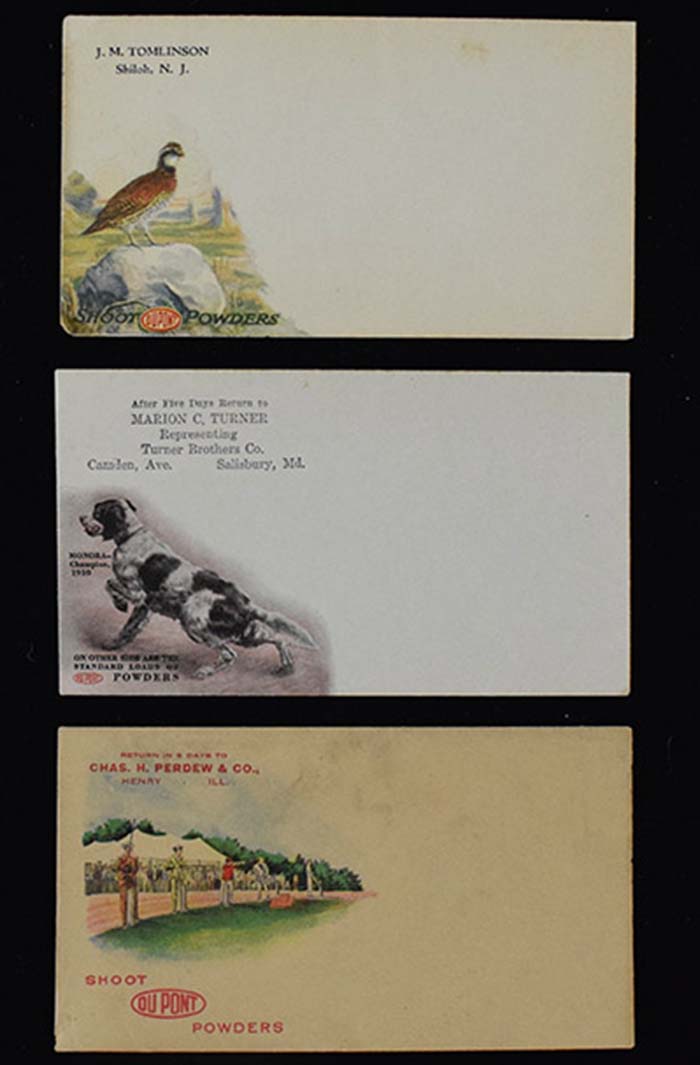 Description:Lot of (3) c.1910s-30s DuPont advertising covers (VG-EX/MT) Trio of unused covers, each employing a nice full color design with backs hosting text aswell. Touch of light toning on (2) which is slightly more accented on one example. Touch of light wear with lower left corner imperfections on two pieces. More heavily toned cover has some more accentuated wear: VG-EX/MT