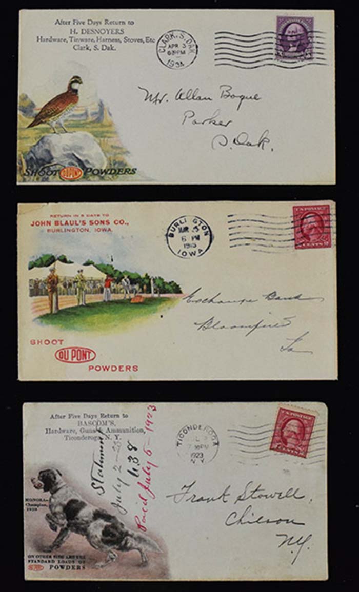 Description:Lot of (3) c.1910s-30s DuPont advertising covers (VG-EX) Trio of postally used covers with nicely designed graphics. Varying degrees of light to moderate wear/toning. One is opened at right side and contains the original correspondence: VG-EX