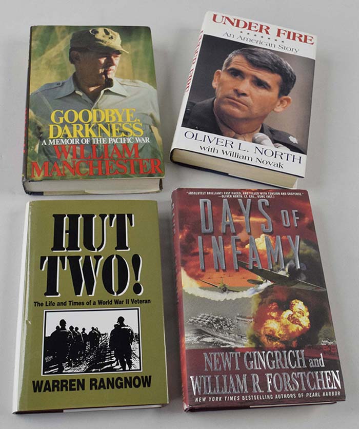 Description:Lot of (11) signed military related books including Oliver North (NM overall). Incl. "Under Fire" signed by Oliver North (personalized); "Days Of Infamy" signed by Newt Gingrich; "Training For Bloody Omaha" signed by Richard Hathaway Jr; "A Tail Gunner's Tail" signed by Gerald McDowell (personalized); "Hut Two!" signed by Warren "Rags" Rangnow (personalized); "Platoon: Bravo Company" signed by Robert Hemphill (personalized); "Victor Six" signed by David Christian (personalized); "Blood Brothers" signed by Michael Weisskopf; "Goodbye, Darkness" signed by William Manchester; "A-Train: Memoirs of a Tuskegee Airman" signed by Chuck "A-Train" Dryden (personalized); and "Fighter Combat" signed by Robert Shaw (personalized). Signatures rate 8 to 10 (avg 9) out of 10: NM overall