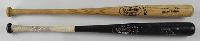 Description:Claudell Washington and Dave Valle professional model baseball bats (VG/EX-EX). Incl. 1990 35" Louisville Slugger T141 Claudell Washington model bat with "C.W. 17" written on the knob in black marker (EX, ball marks, rack marks); and c.1995-96 34" Louisville Slugger T141 David Valle model bat with number "10" written on the knob in silver marker (VG/EX, ball marks, heavy grain swelling, taped handle). Range: VG/EX-EX