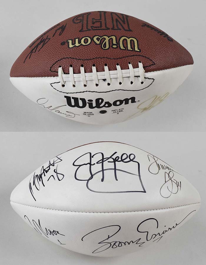 Description:Stars and HOFers multi-signed football (EX/MT). P.Tagliabue NFL white panel football signed by (7) including Jim Kelly, John Elway, Dan Marino, Warren Moon, Thurman Thomas, Bruce Smith, and Boomer Esiason. Signatures rate 6/7 (Elway) to 9/10 (avg 8) out of 10. Areas of discoloration are visible on the white surface: EX/MT