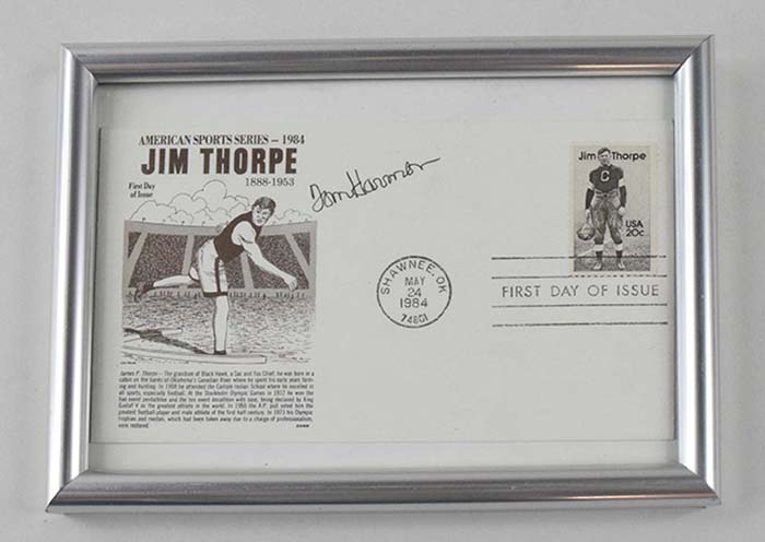 Description:Tom Harmon signed 1984 First Day Cover (NM). Jim Thorpe FDC envelope signed by Harmon in black ink. Signature rates 9 out of 10. Framed, so complete condition is unknown: NM appearance