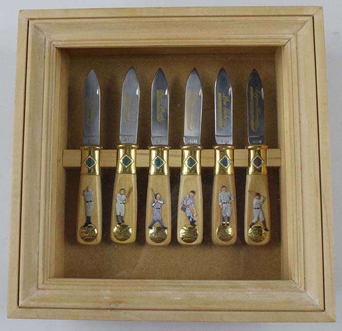 Description:Set of (6) Franklin Mint baseball player collector knives (NM-MT). Knives include Lou Gehrig, Cy Young, Ty Cobb, Rogers Hornsby, Babe Ruth, and Whitey Ford. Also includes all six zippered cases, five boxes, and a custom made display case: NM-MT
