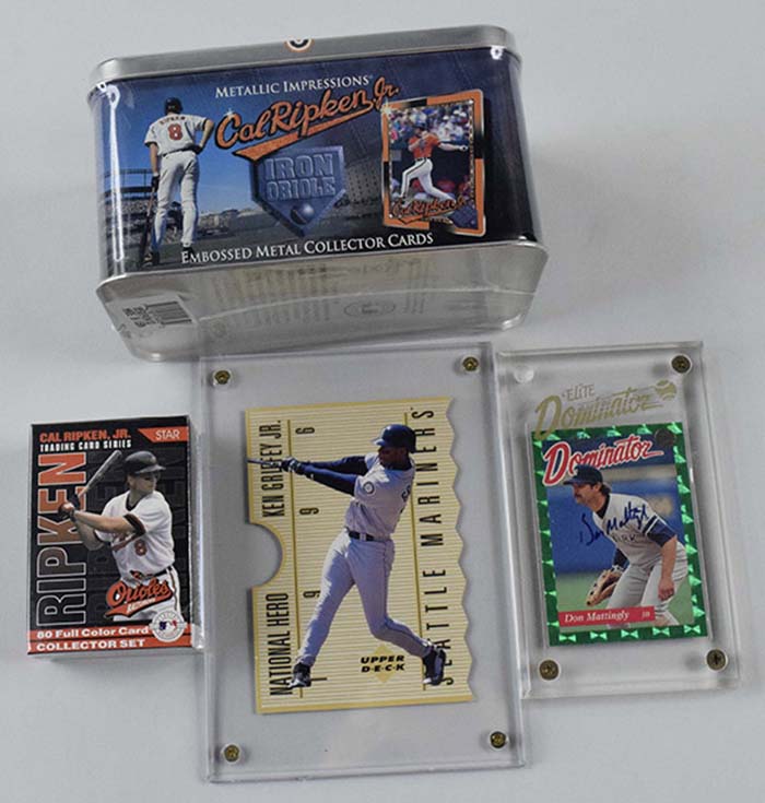 Description:Lot of assorted baseball cards and memorabilia including Mattingly signed insert card (NM-MT overall). Incl. 1993 Donruss "Elite Dominators" #6 signed by Don Mattingly, plus other cards from the Elite Dominators insert set; Cal Ripken Jr items including commemorative metal cards and other baseball cards, and Ripken publications; 1990s Topps baseball coins, and additional cards: NM-MT overall
