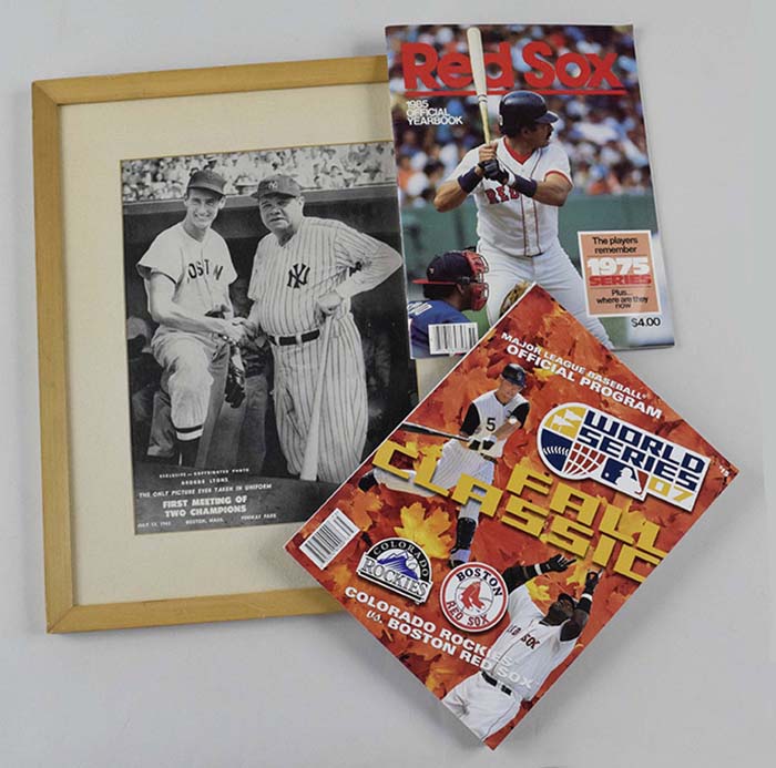 Description:Lot of assorted sports memorabilia and publications (NM overall). Incl. 14"x17" framed photo picturing a 1943 meeting of Ted Williams and Babe Ruth' Modern programs and publications including 2007 World Series program; Modern tickets and ticket stubs (mostly Colorado teams); and uncut sheet of Pepsi 1991 Boston Red Sox team set: NM overall