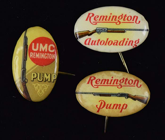 Description:Lot of (3) Remington shotgun advertising pins (VG/EX-EX/MT) Trio of early oval pins (1" across) advertising Remington autoloading and pump shotguns. Mild toning (slightly more accentuated in one instance) and a touch of light wear. Two retain paper inserts on back: VG/EX-EX/MT