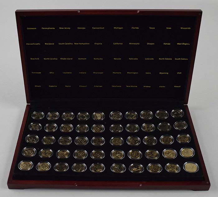 Description:Complete set of (50) gold plated state quarters with display case (MT). Quarters remain in Gem Brilliant Uncirculated condition, and are housed within a high quality wooden display case: MT