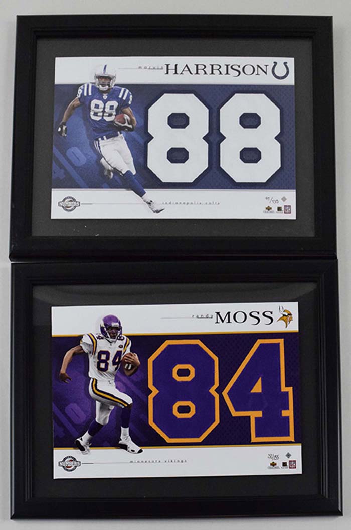 Description:Marvin Harrison and Randy Moss framed limited edition Upper Deck displays (NM-NM/MT). Both are part of the Upper Deck "Jersey Numbers Collection" and measure approx. 16.5"x21". Marvin Harrison is #ed 91/135, and Randy Moss is #ed 32/135. Due to framing, complete conditions are unknown: NM-NM/MT appearance