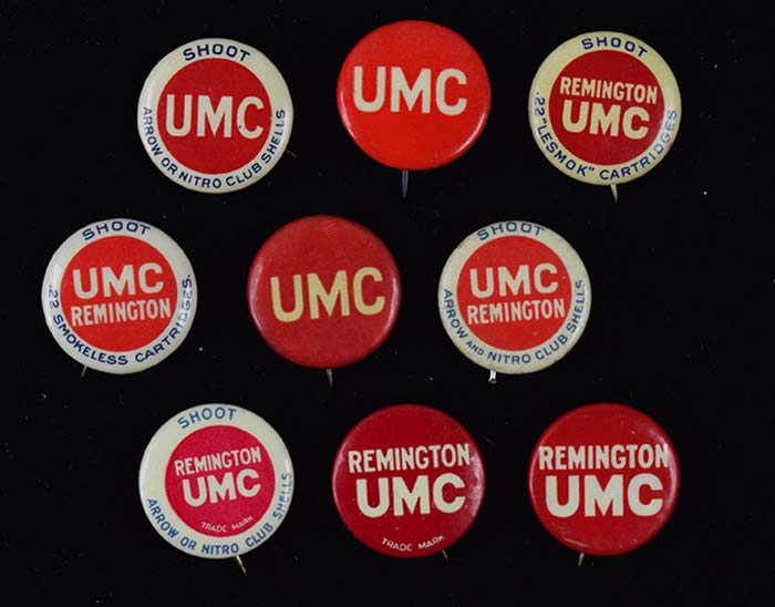 Description:Lot of (9) Remington UMC advertising pins (all different variations) (VG/EX-EX/MT) Includes (5) similar style red with white edge pins with slight variations in text; (4) red background pins with (2) distinct styles and slight variations in either text or color. Each is approx. 1" across. Touch of mild to moderate toning and light wear. Paper inserts remain in backs of (6), (1) of the others has partial insert: VG/EX-EX/MT