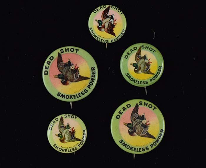 Description:"Dead Shot Smokeless Powder" advertising pins - (5) size and/or maker variations (EX-EX/MT) Includes (2) of the smallest size, each with different maker noted on back inserts, (1) medium (with paper insert), and (2) larger (only one retains insert). Touch of light toning/wear: EX-EX/MT