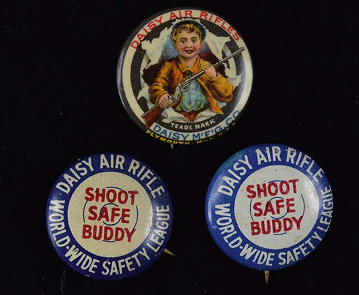 Description:"Daisy Air Rifles" advertising pin with (2) "Shoot Safe Buddy" pins (EX-EX/MT) Trio of Daisy Air Rifle pins includes a rare advertising piece and (2) "Hoot Safe Buddy. All just over .75" across. Touch of light toning/wear: EX-EX/MT
