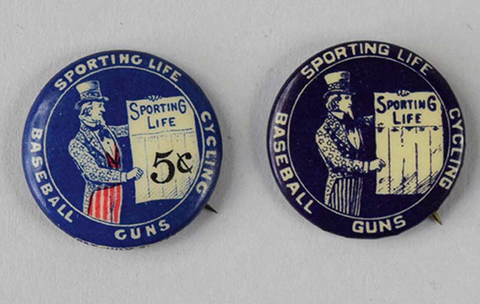 Description:Lot of (2) Sporting Life "Baseball Guns Cycling" advertising pins (color varitations) (VG and EX-EX/MT) Pair of just over .75" pins done in similar style with (1) having color added to design. Hint of light wear to color example which has what may be some residue on paper back insert. Other has more pronounced toning/wear: VG and EX-EX/MT