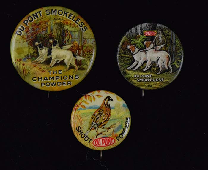 Description:Lot of (3) Dupont Smokeless Powder advertising pins (EX-EX/MT) Trio of pins (just over .75" to 1.25" across) showing light toning/wear. Smallest retains paper back insert: EX-EX/MT