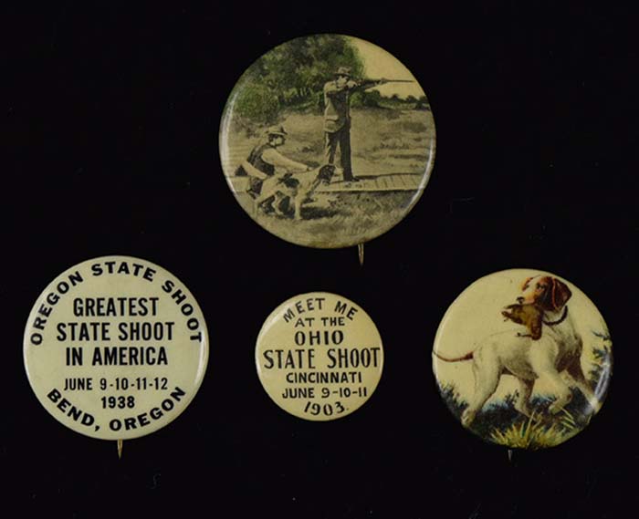 Description:Lot of (4) nice hunting related pins incl. earlier examples (VG/EX-EX) Includes 1903 "Meet Me At The Ohio State Shoot", 1938 "Oregon State Shoot Greatest State Shoot In America", early dog with bird in mouth pin (El Capitan Chewing Gum paper insert on back), and additional pin with an early hunting scene. Varying degrees of light toning/wear: VG/EX-EX