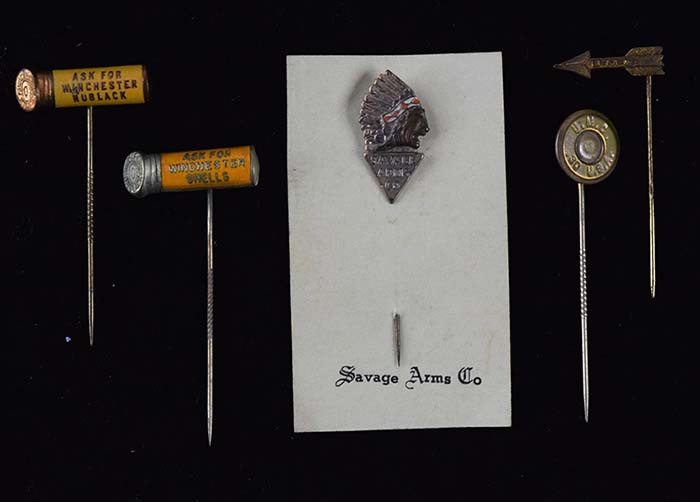 Description:Lot of (5) advertising stick pins incl. Winchester and Savage Arms (EX-EX/MT) Includes "Savage Arms Co" stick pin on original paper stick backing card (colorized portions still filled in); stick pin with figural arrow at top which is lettered "U.M.C."; stick pin with "U.M.C .30 USA" lettered circular upper portion; and (2) done in form of shotgun shell (orange and yellow background variations) which are lettered "Ask For Winchester Shells." Varying degrees of light wear with most being very nicely preserved: EX-EX/MT