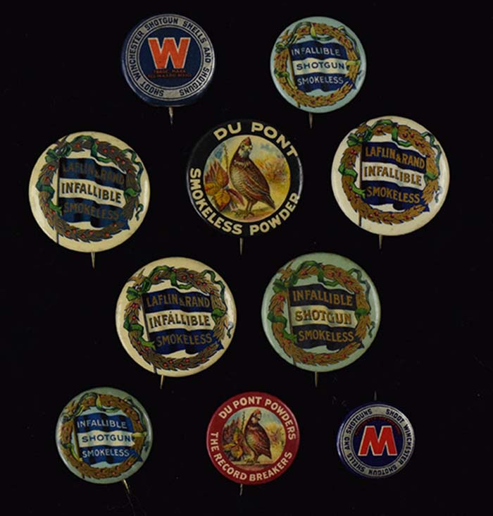 Description:Lot of (10) pins incl. Winchester and Dupont (Mostly EX-EX/MT with 1 lesser) Includes (2) Winchester pins (similar design, two different sizes); (2) DuPont Smokeless Powders (similar designs, two different sizes and colors); (3) Infallible Smokless Shotgun (similar design two different sizes, smaller have DuPont paper inserts on back); and (3) Laflin & Rand brand Infallible Smokeless. Varying degrees of wear throughout: Mostly EX-EX/MT with 1 or two lesser