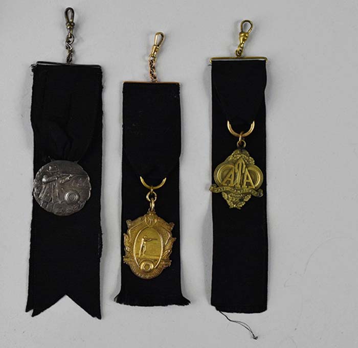 Description:Lot of (3) 1914-1920s shooting award medals incl. (2) ATA and (1) Dupont (VG-EX) Trio of early shooting awards, each remaining on their original black ribbon with clasp at top. Includes American Trap Shooters Assoc. (ATA) medal lettered "1914 State Championship" on front and "+4th Prize+" on back; additional ATA medallion with "State Championship Doubles 1922" on front and "Professional Double Champion 1922 A.J. MacDowell" on back; and undated medal with "Beginner's Trophy" on back below "Dupont" Company logo. Varying degrees of light/mild wear with some fraying to ribbon of Dupont medal: VG-EX