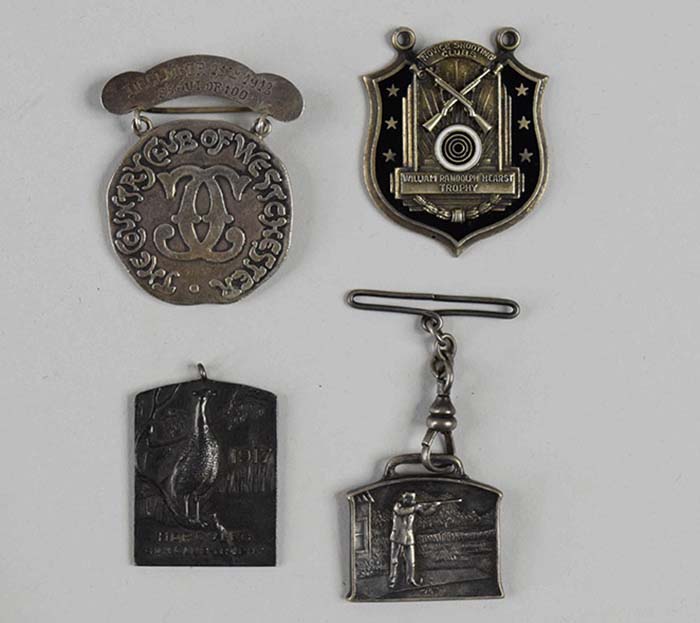 Description:Lot of (3) 1910s Sterling silver shooting award charms/medallions and undated "William Randolph Hearst Trophy" award (EX) Includes ornate presentational Hearst medallion with black enameled background and high relief front plate is marked "Sterling" on otherwise blank back; two piece medal with upper bar reading "December 25th 1913 85 out of 100." Medallion portion has "The Country Club of Westchester" name/logo on front and "Trap Shooting High Gun Won By B.M. Higginson" on back. Top bar is marked "Sterling" on back; charm with a bird/fowl in high relief on front which reads "1917 Hercules Gun Club Trophy", back is marked "Sterling."; and medallion/medal fob on chain which has high relief of shooter on front and is marked "Dupont 1912 Gun Club Trophy Sterling" on back. Varying degrees of light wear and mild/moderate tarnish: EX