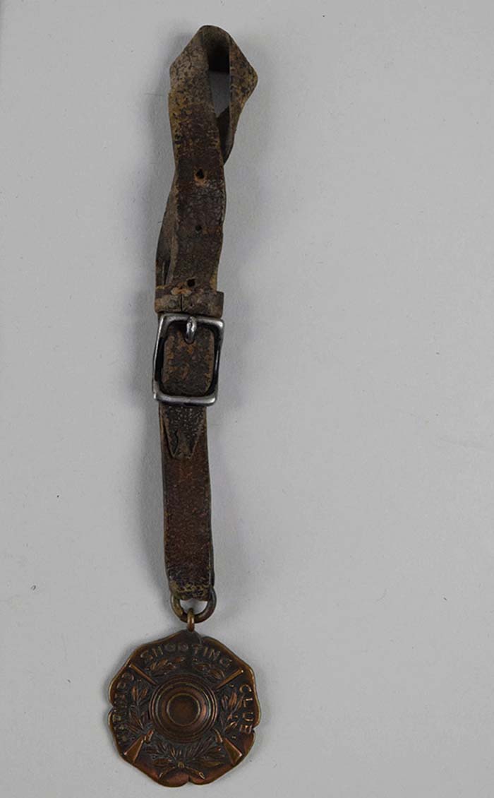 Description:1908 Harvard Shooting Club presentiational fob/medallion (EX) Metal fob with front bearing relief of a pair of rifles and trap and is lettered "Harvard Shooting Club" around the edge. Back is engraved, "Handicap Shoot+" with 1908 date and recipients name. Light tarnish and wear. Remains on original leather band: EX