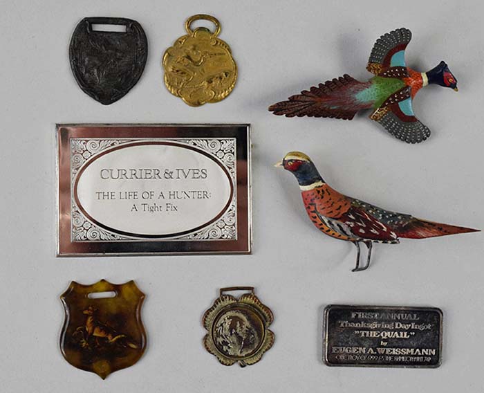 Description:Interesting lot of vintage animal themed fobs, (2) newer handcarved/painted bird pins, and (2) silver ingots (total 4oz) (GD-NM) Includes (2) hand carved and painted bird/fowl pins done in wood with affixed metal clasps; (3) fobs with animal decorations (2 metal, 1 plastic); hunter and dog decorated fob; Currier & Ives Life of a Hunter: Tight Fix commemorative silver ingot (weighs 3 oz); and 1oz. silver Thanksgiving Day Ingot by Hamilton Mint. Varying degrees of light to moderate wear/toning/tarnish which is somewhat heavier in a few cases: GD-NM