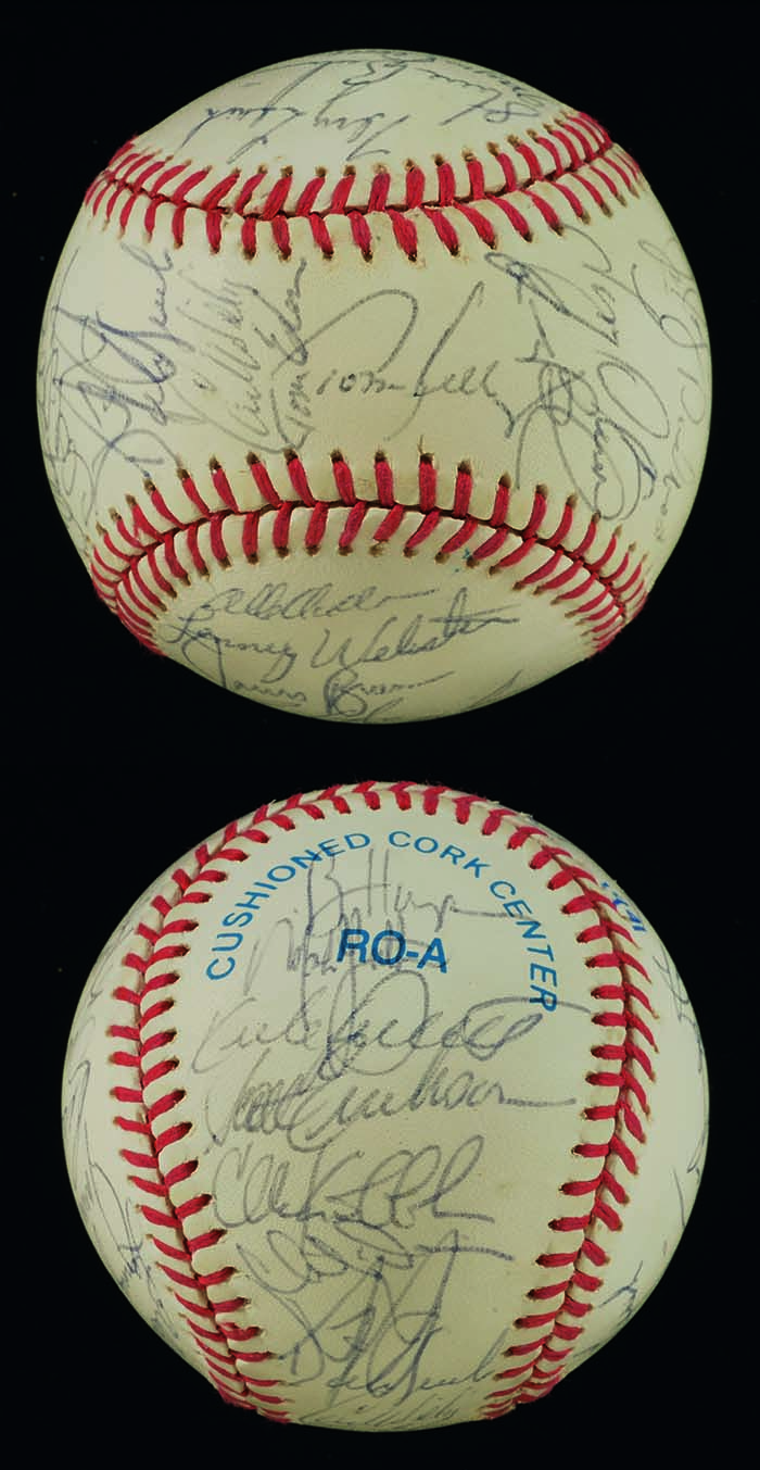 Description:Outstanding 1991 Minnesota Twins World Series Champions team signed baseball with an incredible (36) signatures (EX/MT) Rawlings B.Brown Official American League baseball has been signed by a total of (36) incl. Puckett, Kelly, Knoblauch, Erickson, Gladden, Mack, Oliva, Morris, Hrbek, Bedrosian, and others. Ink signatures rate 7-7/8 out of 10. Exceptionally complete example with desirable first hand provenance. Includes letter of provenance from the Carneal Family: EX/MT ($400-$600)
