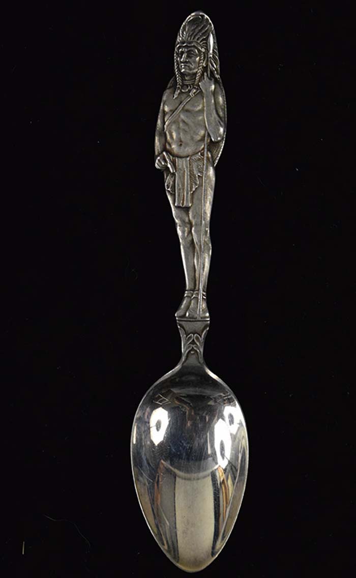 Description:Ornate Native American with pistol decorated Sterling silver spoon (EX) Visually appealing and highly detailed design. Marked "Sterling" on back. Light wear: EX