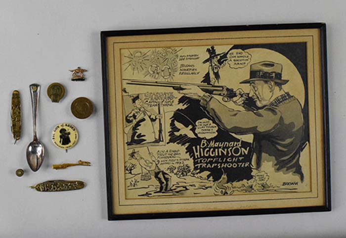 Description:Lot of (10) vintage hunting and/or outdoors related pieces incl. artwork, pocket knives, spoon, tieclip, and pins (VG to EX/MT-NM) Includes 12.5"x15" framed vintage illustration style artwork of "B.Maynard Higginson Topflight Trapshooter"; spoon with "DRR" logo applied which is engraved "Trap Shooting" on handle; (2) pocket knives with hunting or animal decorations; "Special Fish Warden Board of Fish Commissioners" pin marked "1506 Penna" on back; tieclip done in form of a rifle with fox perched atop; small hunting dog charm; "FTC Gun of Arden Retriever Trial July 1945" 1.75" pin; small .44 Mag Rem marked lapel pin done to resemble end of bullet; bolo tie clasp with skeet/bird decor which is engraved "5 Man Team" on back. Varying degrees of mostly light wear: VG to EX/MT-NM