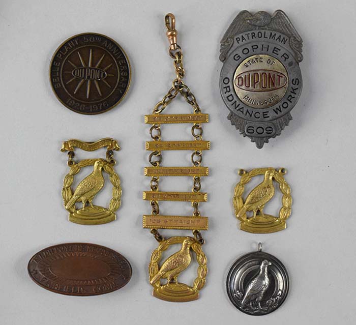 Description:Lot of (7) asst. Dupont marked/related pieces incl. Patrolman badge, charms/medallions, fob, and others (Range VG to EX/MT-NM) Includes "Patrolman Gopher Ordnance Works" badge with Dupont logo at center; circular medallion with Dupont mark and "Trapshooting Trophy" marked back; (6) section fob with engraved bars having different accomplishments listed and lower portion marked "Long Run Trophy Dupont..." on back; similar style (2) piece medal; additional lower portion (no upper bars) of the same design; oval pin done in brass lettered "E.I. Du Pont De Nemours..." at top with blank center (possibly employee ID badge which was never used); and 1976 Dupont Belle Plant 50th Anniversary coin. Varying degrees of wear throughout: Range VG to EX/MT-NM
