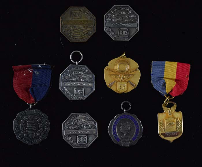 Description:Lot of (8) mostly hunting/shooting related awards/medallions incl. (4) Sterling and (2) gold filled (GD-EX) Includes medal on ribbon which has trap on front and the year "1940" engraved below. Engraved "Court Club Champion" on back and marked "GF"; medallion with pair of crossed rifles and trap on front which is engraved "1939." Back reads "N.J. Northern Zone All Around Champion 1939" and is marked "1/10 10K GF."; (4) octagonal American Amateur Trapshooters Association presentational percentage coins with names engraved, one of which is marked Sterling; Sterling marked charm with enameled "New Jersey Div. Athletics" titling/logo on front and "Trap Shooting 1922" on back; Sterling marked charm on ribbon which has trap on front and "1930" on back; Sterling marked medallion on ribbon which reads "University of Pennsylvania 29th Relay Race Carnival" on front and "2nd Prize High Schools" on back. Varying degrees of wear throughout: GD-EX