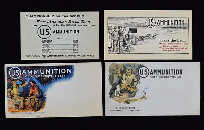 Description:"Us Ammunition" pictorial advertising envelopes (2) with related material (EX/MT-NM) Vintage envelopse with crisp colorful decorations on front (EX and EX/MT-NM). Includes fact booklet and paper slip. Little wear with a hint of toning, more pronounced wear to one envelope: EX/MT-NM