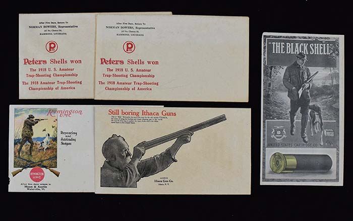 Description:Lot of (5) vintage gun/ammunition related advertising envelopes (VG/EX-EX/MT) Includes (1) Remingont with hunting scene illustrated, "The Black Shell United States Cartridge Co", Ithaca Gun Co. "Still boring Ithaca Guns", and (2) Peters Shells (one with some stray pencil marks, other split open along one side): VG/EX-EX/MT