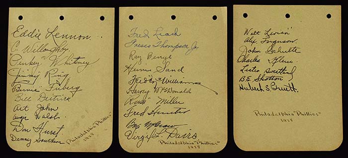 Description:1928 Philadelphia Phillies team signed album pages with Chuck Klein (EX/MT) Trio of album pages containing a total of (27) vintage fountain pen signatures incl. full name Chuck Klein, Cy Williams, Burt Shotton, Bernie Friberg, Jimmy Ring, Pinkey Whitney, and others. Signatures rate 8 to 8/9 out of 10, pages have little mentionable wear with some spotting to a small area of one: EX/MT ($300-$500)