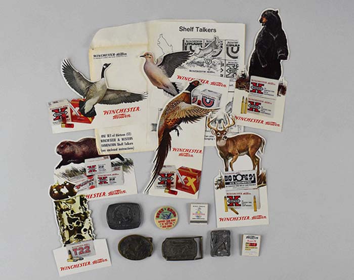 Description:Nice lot of asst. hunting and gun related pieces incl. Winchester pin and store displays, Atlas Powder pocket knife, and others (EX-NM) Includes "Pro-Marksman Junior Winchester Rifle Corps" two piece pin; "Guns & Ammo Magazine Support Your Right+" 2" pin/button; (2) Winchester matchbooks; "Atlas Powder Company" marked pocket knife; (4) belt buckles incl. Remington with dog and rifle (appears vintage c.1960s), Waterfowl USA (dated 1988 on back), 1979 L.L. Bean Mallards, and North American Hunting Club Lifetime Member (with name impressed); and set of (13) heavy stock color illustrated Winchester die-cut store advertising pieces with original envelope and paper insert. Varying degrees of wear throughout: EX-NM