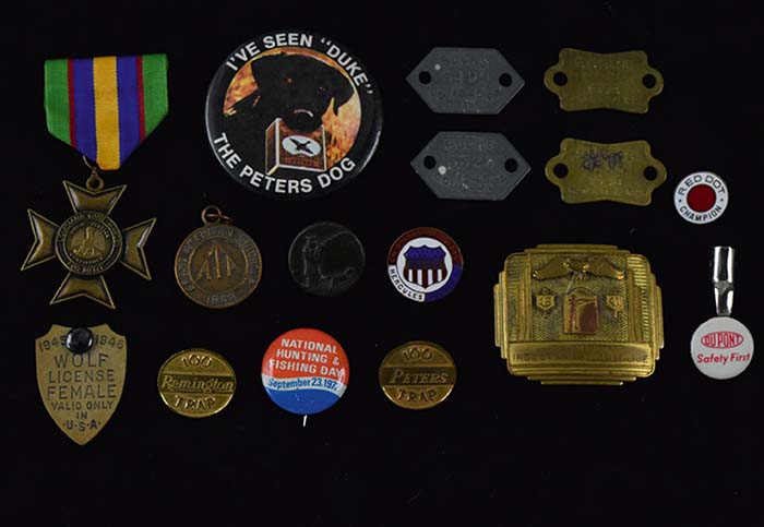 Description:Large lot of c.1950s-present hunting, shooting, and outdoors related pins, belt buckles, etc. (incl. hunting tags) (GD-NM) Intersting mix of pins and other asst. similar type collectible pieces related to hunting, animals, or outdoors in general includes pair of early buttons with hunter/dog scene on front; asst. deer or hunting tags incl. 1945-46 Wolf License Female, (2) 1945 Bucks County, (2) 1948 Bucks County, and 2013 PA Commission ear tag; 1941 Industrial Trap League Champion belt buckle; 1942 Grand American Handicap charm;1966 1978 Remington Shooting Star pins and Peters Shooting Ace pins from same years; Remington and Peters "100 Trap" pins; small North American Hunting Club charm; life member pin from Pocono Slate Ble Shooting Association and abd "50 Straight" pin from the same organization (with 75 and 100 Straight bars added below); Quail Unlimited charter member pin; Winchester Buffalo Bill commem pin; small NRA lapel pin with screw down back closure; (2) official looking uniform accent pins reading "B234"; Louisianna Game Warden Merit pin; Colt Authentic Black Powder lapel pin; Hercules Powder Co Industrial Solider pin; 1967 Winchester Claybird Tournament pin; (2) 1972 National Hunting and Fishing Day pins; "Red Dot Champion" pin; Dupont Safety First pencil topper; NRA key chain; Dupont 1938 Delaware Tercentenary pin; Duke The Peters Dog pin; and (11) other asst. modern pins.