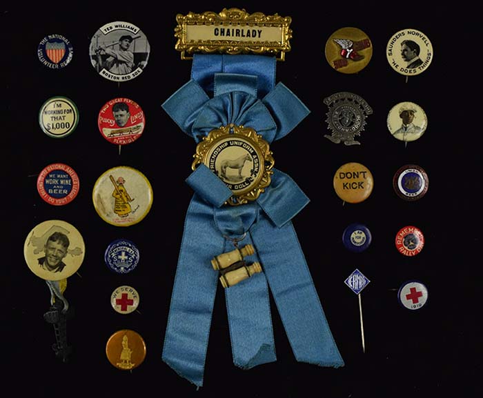 Description:Nice lot of vintage pins covering a variety of subjects and incl. notables, red cross, and some other better pieces (38 pins + others) (Range GD-EX/MT) Interesting assortment includes large and ornate piece with pin backed metal bar at top that has "Chairlady" insert on front. Hanging from this is blue ribbon which has a metal shield mounted at center featuring an image of a horse on celluloid and reads, "Friendship Uniform Assn. Our Doll." Hanging below is a charm in the form of small binocular; Charles Lindbergh photo pin with attached metal plane charm; additional Lindbergh pin showing him with a sled with text reading "Two Great Flyers Lucky Lindy And The Flexible"; yellow kid pin with High Admiral paper insert on back. He is shown with baseball bat and "...pitch fer New Yorks..." text (scuff/dent on front); Anthony Hamilton Celebrated Jockey Pepsin Gum pin; photographic pin with bust picture at center and text reading "Saunders Norvell He Does Things"; pin with image of what appears to be a Native American woman and the captioning "D. of P."; small pin reading I'm Working For That $1,000; (10) Red Cross related pins (incl. pins dated 1919, 20, 21, and 31); a small Salvation Army shield (not with a pin backing, has flaps for mounting); "Modern Health Crusader" pin; "National Volunteer Reserve" pin; pin which reads in full "We Want Work Wine and Beer - I Belong To The Rational America League - Do You?"; Ted Williams Boston Red Sox pin; United Brewery Workmen enameled pin with screw down back closure; and an assortment of other pins with the following text or slogans - Don+t Kick, I Am For Pennsylvania, Greencastle PA Old Home Week August 17-22 1908, Remember Rally Day, Rally Day I Was There, I Care Community Chest (no pin backing), CE Rally Feb. 7 1924, 500 Club, Help Save The Tower, ERMA (stickpin), Waynesboro Chautauqua July 13 to 19, Memorail U.B. SS, and I Did Hospital Fund. Also includes a 1934 "Bridge Token" and a small "Blue Label Tomato Ketchup" metal piece which may have been a pin with the back broken off. Varying degrees of wear throughout: Range GD-EX/MT