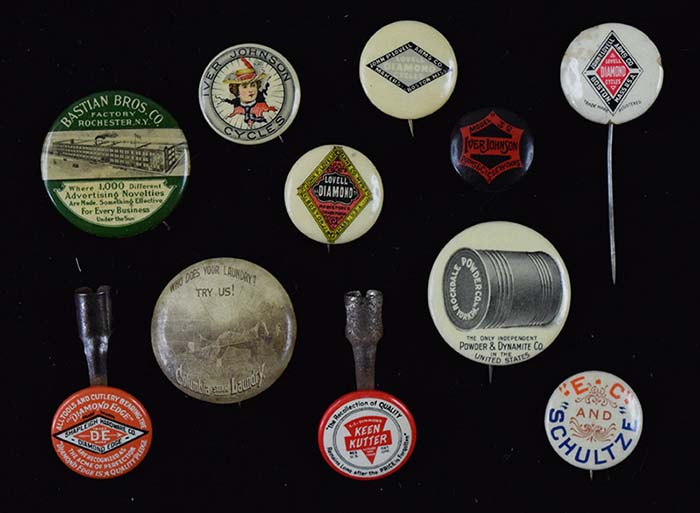 Description:Choice lot of (11) early advertising pins/related incl. Bastian Bros, Lovell Diamond, and Iver Johnson (VG-EX/MT) Includes pin which shows their factory and is titled "Bastian Bros. Co." with captioning to read "Where 1,000 Different Advertising Novelties Are Made." An interesting piece of relation to an enormous number of now collectible pins; "Rockdale Powder & Dynamite Co" pin; very early sepia toned real photo pin showing a horse and carriage which reads, "Who Does Your Laundry? Try Us! Columbia Steam Laundry." Marked "Penn Button Works Phila" on back; (2) Iver Johnson Cycles pieces, one being a pin and the other has backing which appears intended to fill a button hole; "E.C. And Schultze" pin; (2) Lovell Diamond Cycles pins and (1) stick pin; and (2) pencil toppers promoting "Shapleigh Hardware Co. Diamond Edge" and "E.C. Simmons Keen Kutter Cutlery." Varying degrees of wear throughout: VG-EX/MT