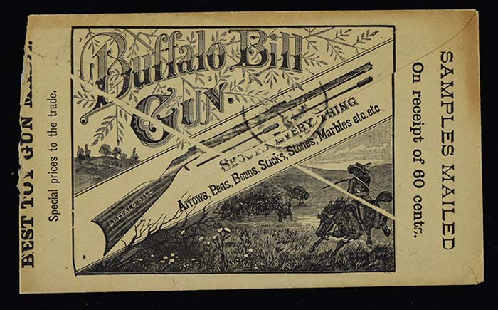 Description:1886 "Buffalo Bill Gun" Wilson Brothers advertising cover (EX) Vintage advertising envelope with 1886 postmark has the "Wilson Brothers Woodenware & Toy Co." name and return address on front. Back has a beautifully designed "Buffalo Bill Gun" advertisement. Mild toning with some light general use and age wear with torn open right edge. Inside is an orinal sheet of Wilson Brother stationary with handwritten letter: EX