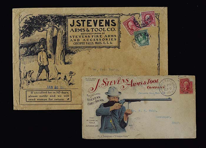 Description:J. Stevens Arms & Tool Co. 1903 advertising cover and larger 1915 mailing envelope (VG-EX) Includes colorfully illustrated cover postmarked 1903 and a larger heavier stock mailing envelope which has 1911 date stamped on front. Scattered wear includes chipping and small edge tears along with some mild toning: VG-EX