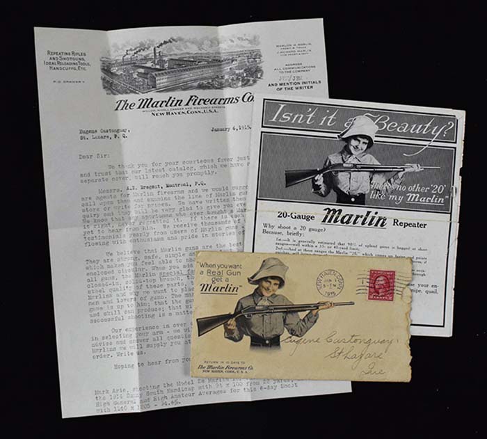 Description:1915 Marlin Firearms advertising cover and related material (EX) Beautifully illustrated cover postmarked 1915 has some light general handling and age wear and been opened along right edge. Includes the original letter which was sent therein (on Company letterhead) and small advertising brochure for their (20) guage repeater (similar levels of wear): EX