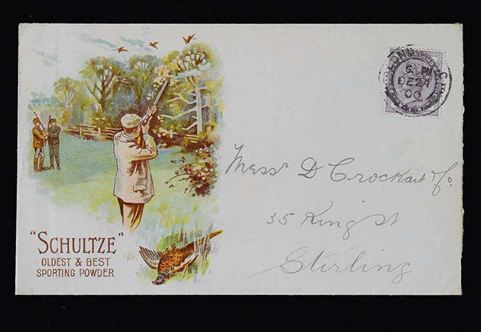 Description:1900 Schultze Sporting Powder advertising cover (EX) Nicely illustrated and desirable cover has a touch of light natural wear. Right edge has been slit open: EX