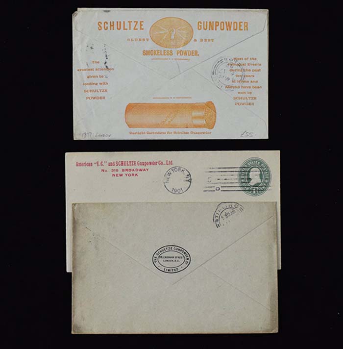 Description:Lot of (4) Schultze Gunpowder advertising and/or related envelopes (Overall EX) Includes (2) which have advertising printed on backs (postmarked 1897 and 1899, both with small pencil notations from prior sale) and a pair of mailing envelopes with the Company return address. One is postmarked 1901; the other postmark can not be read but it dates to similar period. All have been mailed and have varying degrees of general handling and age wear. One has a side cut open: Overall EX